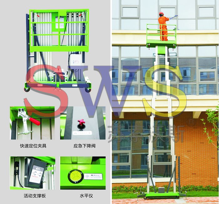 升降桅柱全部用用高強(qiáng)度鋁合金型材,整機(jī)重量輕,移動十分方便。